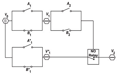Fig. 2. V0 is a power source. The Vi are power buses with V2 the consequential effect. The Ai and Bi are binary switches. The Bi are the context and the Ai are causal antecedents.With B2 off, the NO (normally open) relay completes a circuit between V0 and V2 only if A2 is on.